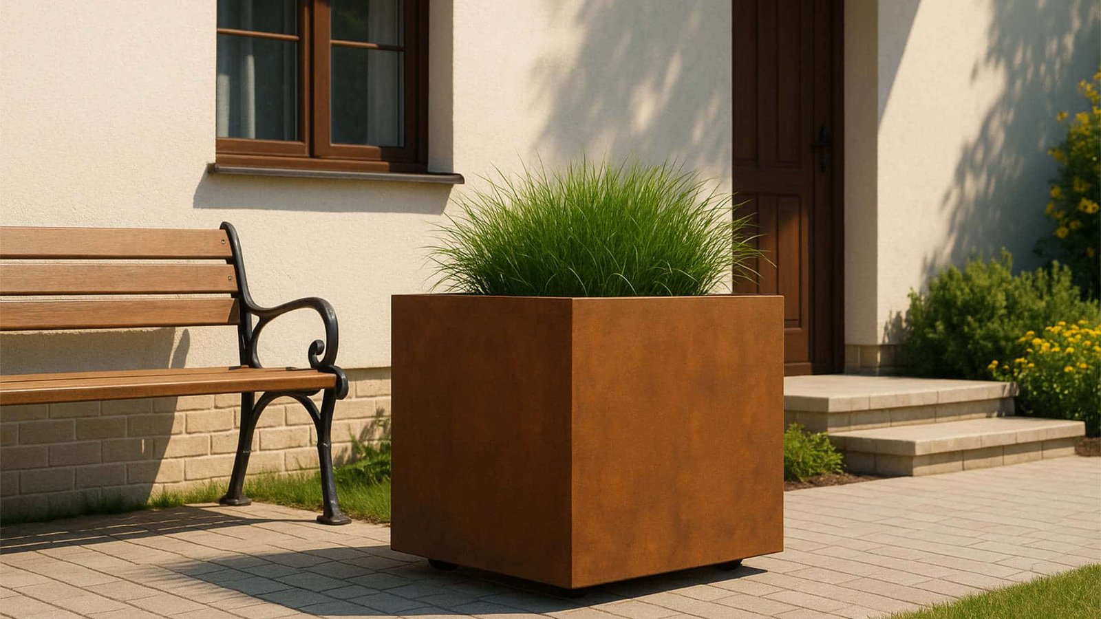 Große Blumentopf mit Rollen sieht schon fast so aus wie ein kleiner Garten auf Rädern. Solider Cortenstahl sieht nicht nur edel aus, er ist zudem extrem widerstandsfähig. Grau geliefert, verfärbt sich der Baustahl rostbraun. Sulfate oder Phosphate verhindern, dass es zu Rostlöchern, etc. kommen kann. Der Pflanzkübel aus Cortenstahl auf Rollen für draußen kann als Garten, als Disneyland für Kinder oder als mobiles Gemüsebeet genutzt werden.