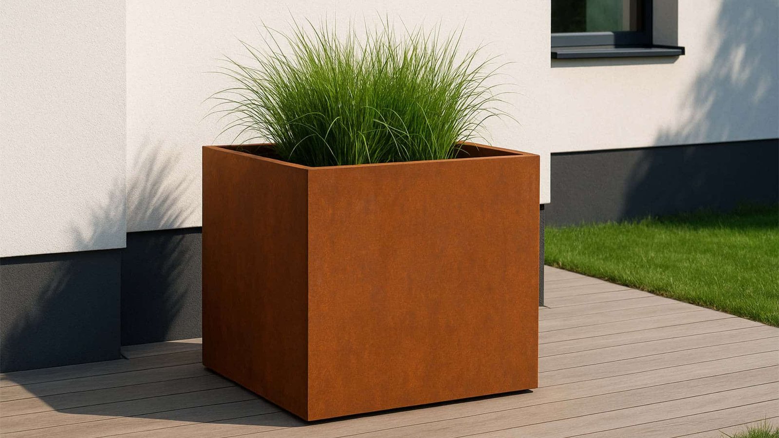 Unter Cortenstahl ist ein äußerst wetterfester Baustahl zu verstehen. Auf Grund der chemischen Zusammensetzung des Stahls bildet sich auf dessen Oberfläche eine Patinaschicht in Rostoptik. Die Patina besteht hauptsächlich aus festen Phosphaten und Sulfaten. Diese Schicht fungiert als eine Art dichte Sperrschicht, die den darunter liegenden Stahl nicht mehr mit Sauerstoff in Kontakt treten lässt. Sauerstoff wird für die Korrosion von Metallen zwingen benötigt. Damit ist der darunter liegende Stahl vor einer fortschreitenden Korrosion geschützt. Pflanzenkübel aus Cortenstahl sind daher äußerst langlebig.
