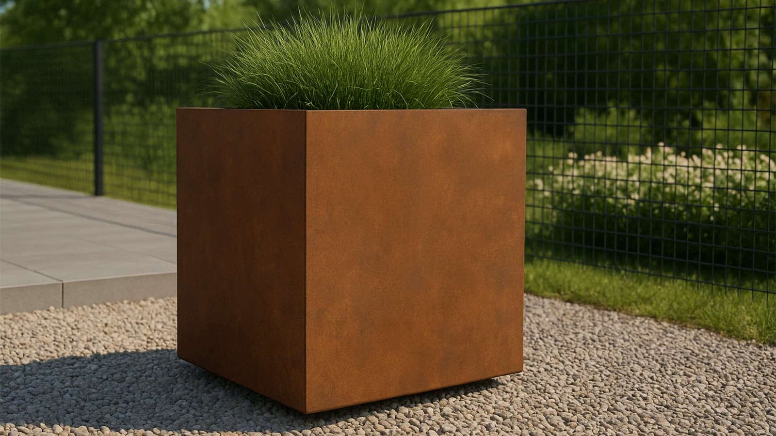 Der Pflanzkübel auf Rollen besteht aus hochwertigem 2 mm-Cortenstahl. Die Abmessungen von 1000 mm x 1103 mm x 1000 mm sowie das hohe Gewicht von 85 kg macht den Pflanztrog zu einer soliden Festung für jede Pflanze. Kurze, soldie Standbeine verbergen Rollen dahinter, mit denen der Pflanztrog trotz des Gewichtes leicht transportiert werden kann. Der Wasserabfluss schützt den Trog vor Frost. Die UV-Beständigkeit erhöht die Langlebigkeit.