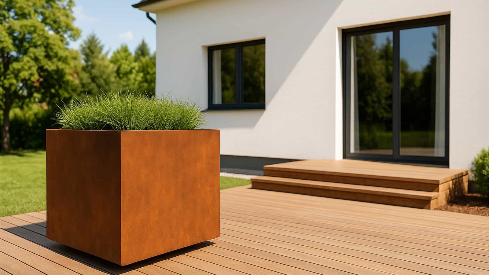 Der Pflanzkübel XXL mit Rollen eignet sich aufgrund seiner enormen Größe und des Gewichtes als Pflanztrog für den Profigebrauch bzw. für extrem große Flächen. Hier lassen sich große Landschaften mit Springbrunnen oder Vogelvolieren anlegen. Der graue Cortenstahl wechselt durch die Bewitterung im Außenbereich zu rostbraun. Eine Sperrschicht aus Sulfaten und Phosphaten verhindert ein Rosten und somit die Beschädigung des XXL Pflanzkübels. Damit ist der große Pflanzkübel optimal für den Außenbereich. Allerdings benötigt der Trog eine Fläche von 1,50 m x 1,5 m.